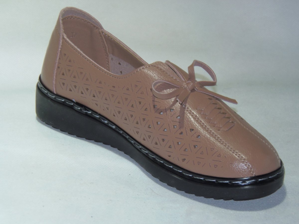 Półbuty damskie wsuwane z gumką i kokardką, podeszwa klin szyta, z dziurkami na wierzchu PU.